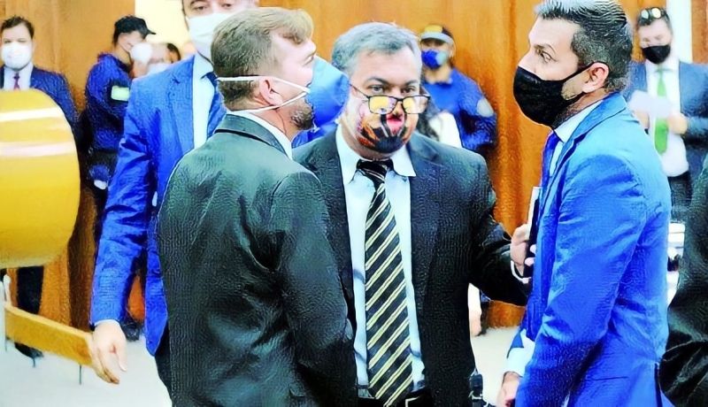 Kleybe Morais (máscara colorida) intervém em discussão entre Azulão Jr (máscara azul) e Novandir (máscara preta) (Foto: Alberto Maia/ Câmara Municipal)