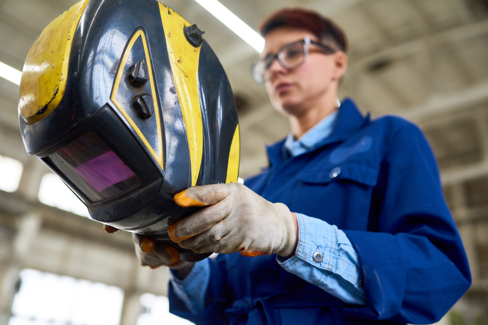 Portrait of modern young woman holding welding mask standing in industrial workshop of modern factory, focus on foreground