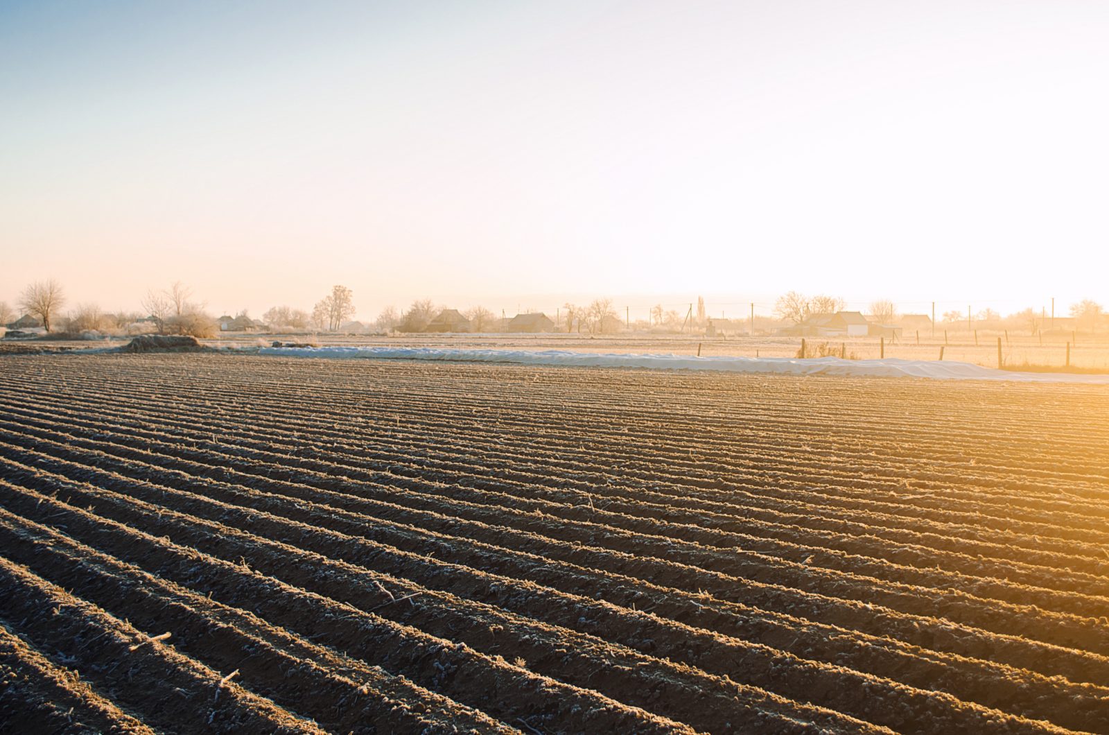 Winter farm field ready for new planting season. Preparatory agricultural work for spring. Choosing right time for sow fields plant seeds, protection from spring frosts. Agriculture and agribusiness.