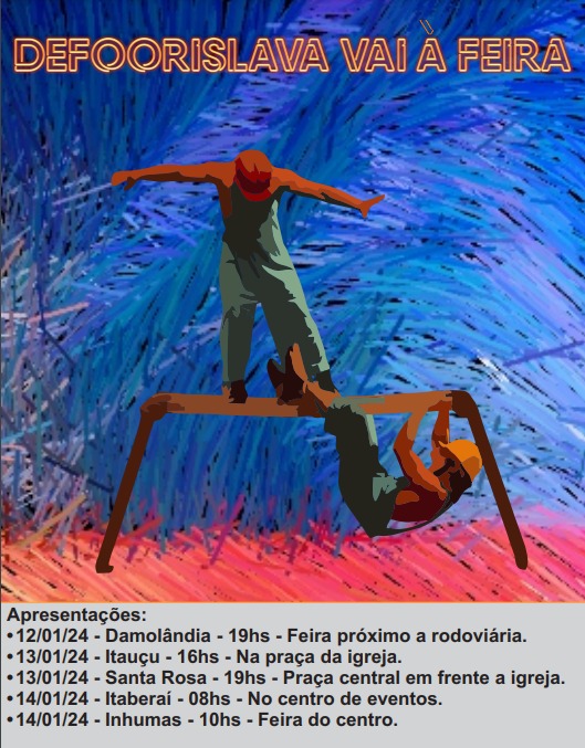 Nos dias 12, 13 e 14 de janeiro, os municípios de Santa Rosa, Itaberaí, Inhumas, Damolândia e Itauçu receberão o espetáculo “Defloorislava Vai À Feira”, um espetáculo cômico de acrobacia cênica apresentados por dois artistas circenses, os palhaços Tostão e Leitão. As apresentações serão gratuitas e vão acontecer nas feiras livres dos municípios.