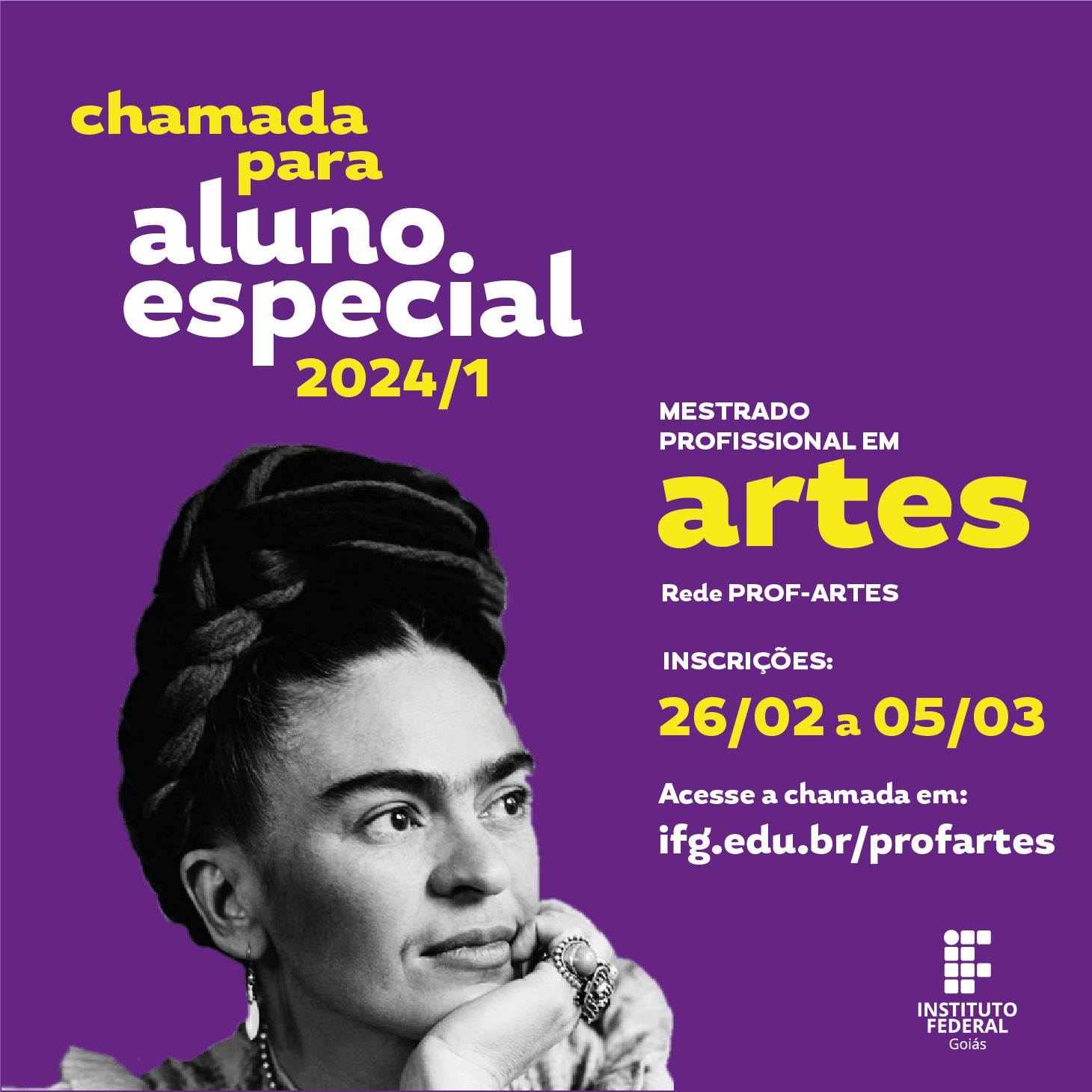 Estão abertas até o dia 5 de março as inscrições para alunos especiais do Mestrado Profissional em Artes (Rede ProfArtes/IFG). Os interessados em cursar disciplinas isoladas do Mestrado devem enviar carta de intenção à Coordenação do Mestrado, indicando a disciplina que quer cursar e outros itens listados no Comunicado “Vagas para Alunos Especiais no Semestre 2024/1”, disponível no link https://www.ifg.edu.br/attachments/article/18096/comunicado_chamada_aluno_especial_2024.pdf